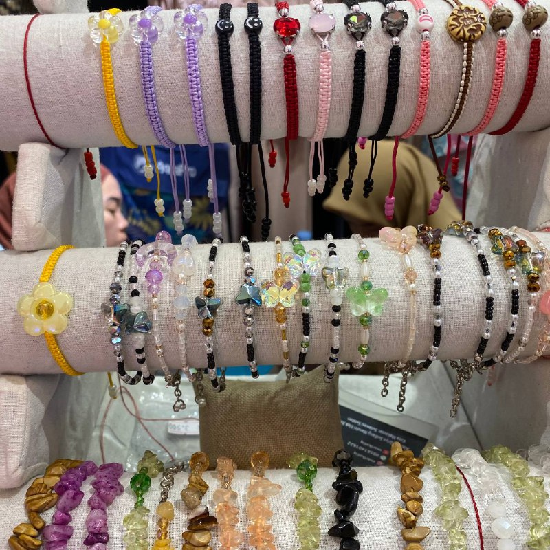 Rangkaian gelang dengan gaya bohemian dan playful. Menampilkan bunga akrilik, kupu-kupu, dan beads dengan warna cerah seperti kuning, ungu, merah, dan hijau. Desain ini cocok untuk acara santai, festival, atau sebagai statement look yang fun dan berbeda dari gelang biasa.