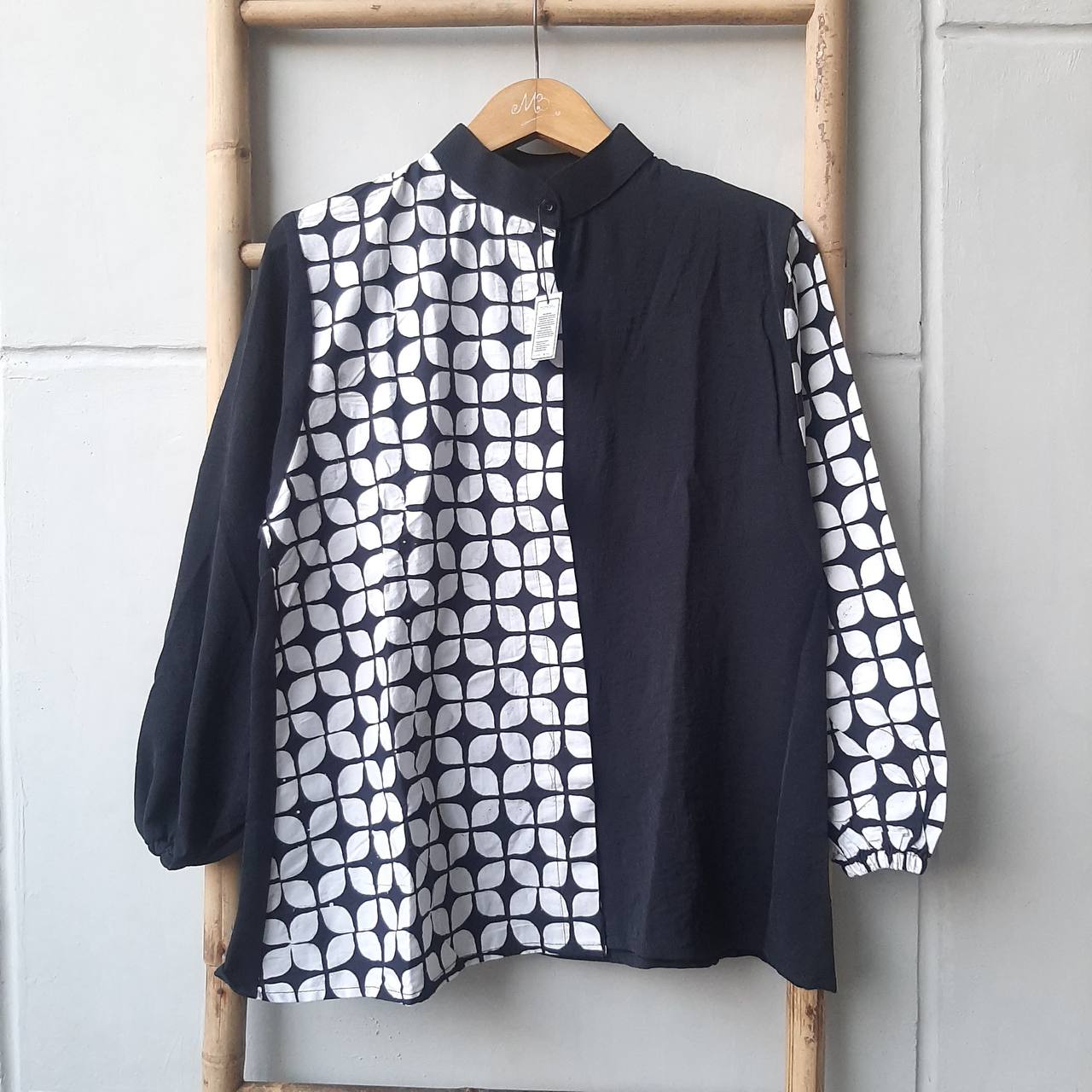 Kemeja lengan panjang dengan perpaduan dua warna kontras: hitam polos di satu sisi dan motif geometris putih di sisi lainnya. Desain ini memberi kesan modern, minimalis, dan kuat saat dikenakan. Potongannya longgar, cocok untuk dipakai harian atau acara semi-formal.