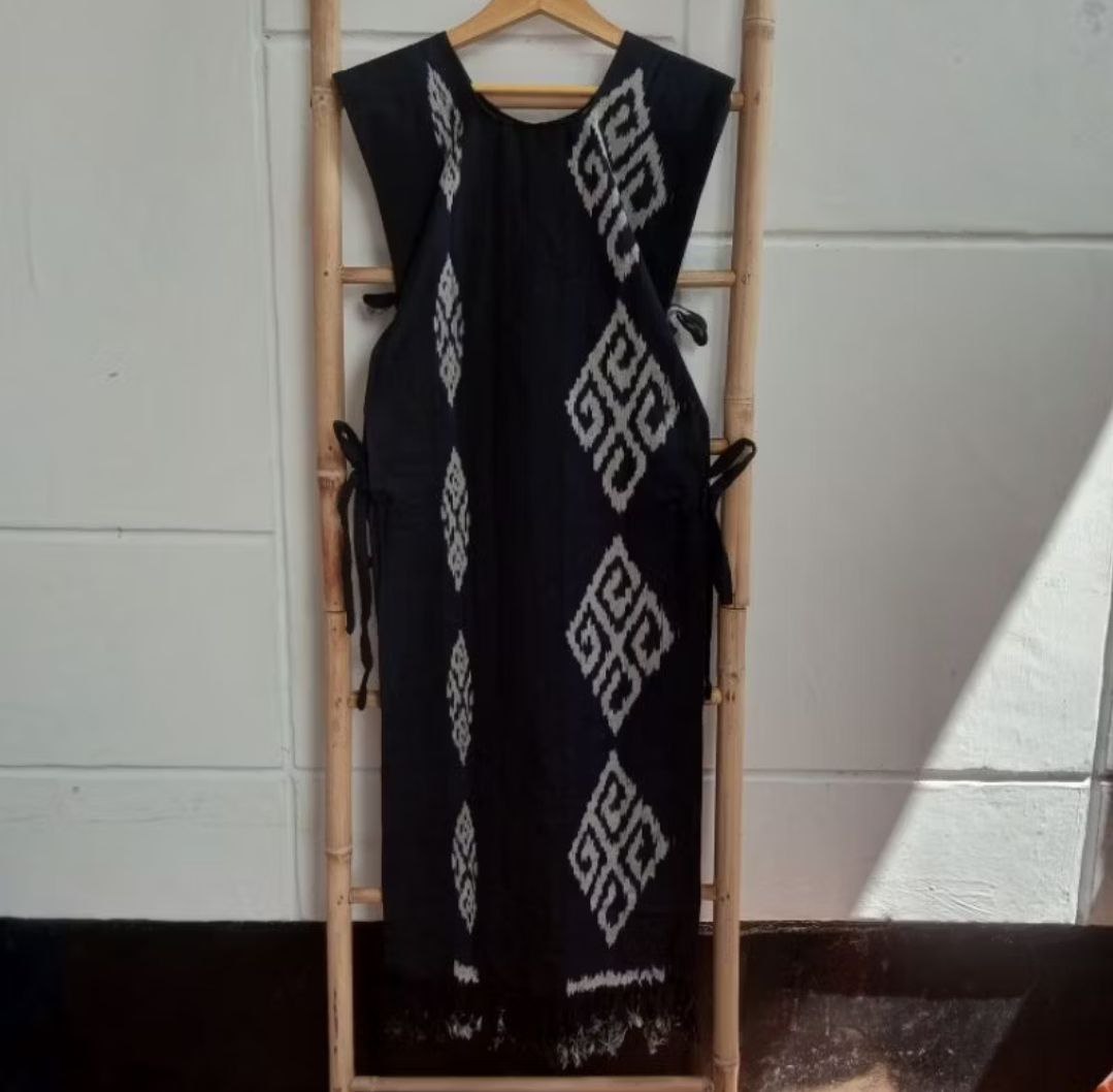 Kain tenun ini menampilkan kekayaan budaya melalui motif geometris berbentuk berlian yang disusun vertikal di bagian depan. Potongannya lurus tanpa lengan dengan detail tali samping yang dapat disesuaikan sesuai ukuran tubuh. Warna dasar hitam dipadukan dengan motif putih kontras, menciptakan tampilan klasik yang kuat. Cocok dipadukan dengan inner polos sebagai outfit kasual etnik ataupun acara budaya.