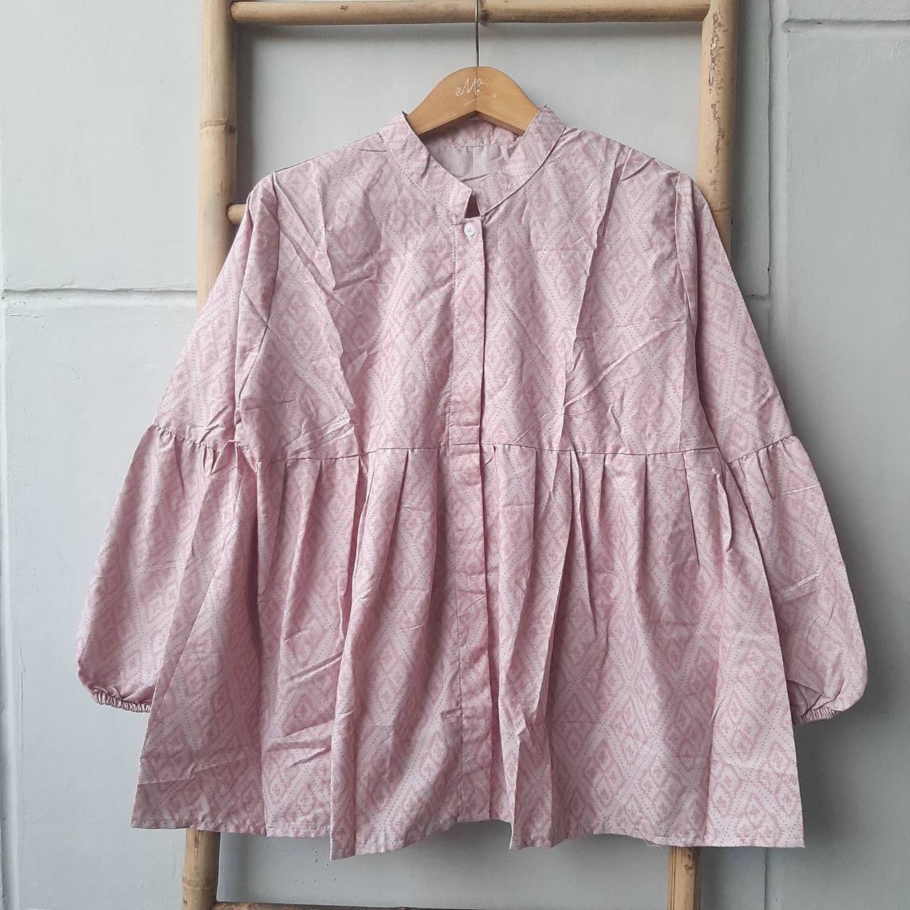Blus ini terbuat dari kain batik yang ringan dan adem, jadi cocok dipakai di cuaca panas atau seharian beraktivitas. Warnanya merah muda lembut dengan motif etnik yang memberi kesan manis dan tenang. Bagian atas blus menggunakan kancing depan penuh, memudahkan saat dipakai dan dilepas. Blus ini juga punya potongan babydoll, yaitu agak mengembang di bagian bawah setelah lipatan pinggang.